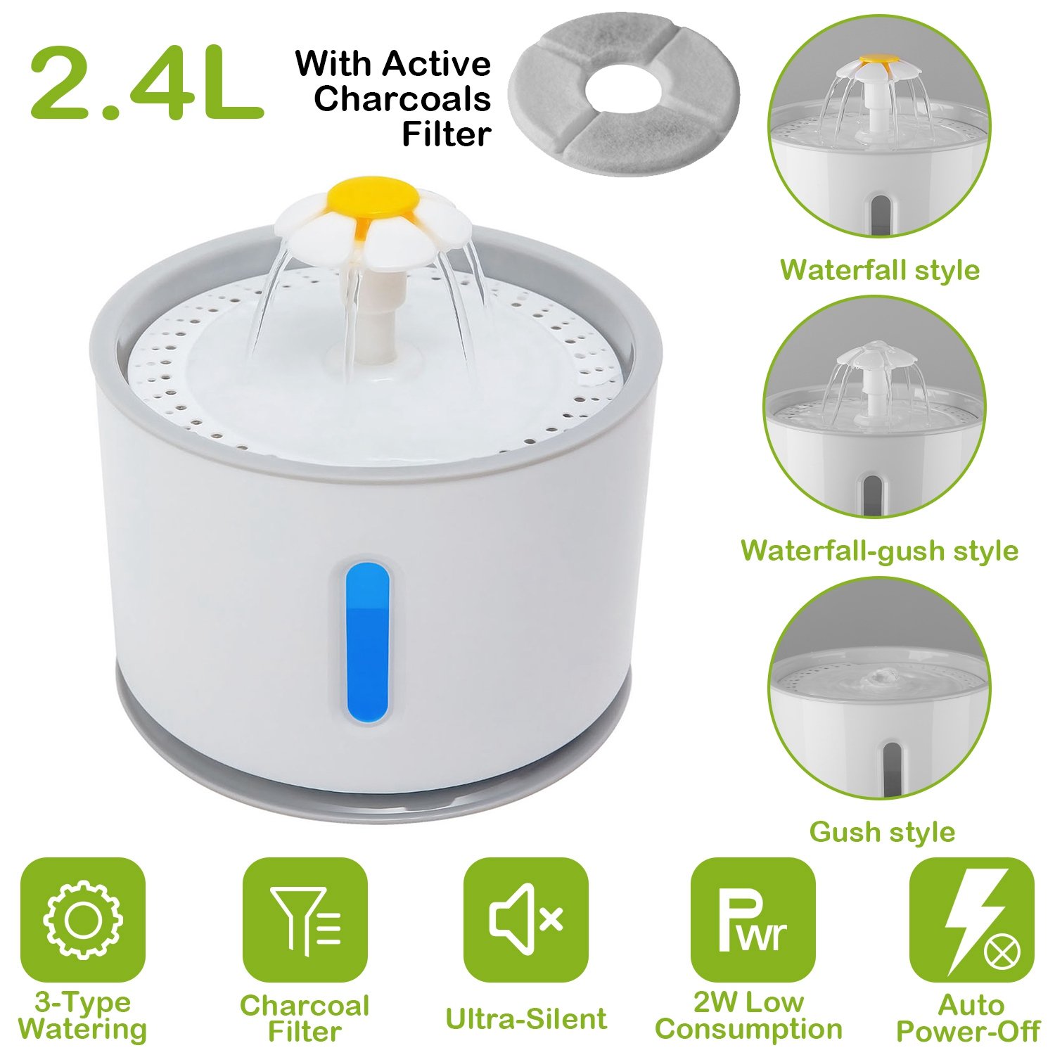 Are you looking for a strong but hygienic fountain to solve the drinking problem of your pet cat or dog? Our automatic daisy flower-shaped fountain may meet your needs. It comes with 2.4L large water capacity to effectively decrease the frequency to replenish water and ease your time and can provide 3 watering types (waterfall style, gush style and waterfall-gush style) to attract and pleasure your pet to drink. Built-in a LED light and a visible window, it can allow you to see the water level conveniently and designing an auto power off function in water shortage state to ensure your pet and the fountain safe. Additionally, it owns a cocoanut shell active charcoal filter to ensure the purity of the water by effectively removing the hair of you cat, bad odor, adverse chlorine and heavy metal contained in the water.